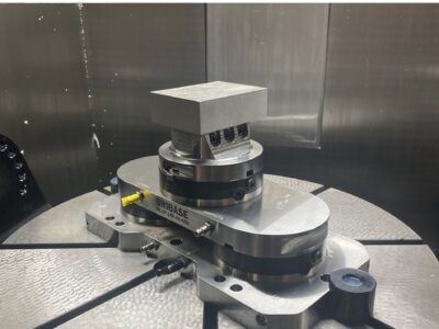 Тиски BB.VS.080.11.005 установлены через устройство базирования с одним модулем в поворотный стол станка (4ая ось):